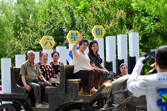 在新疆伊犁哈萨克自治州伊宁市六星街,游客在中心广场打卡拍照。新华社记者 丁磊 摄
