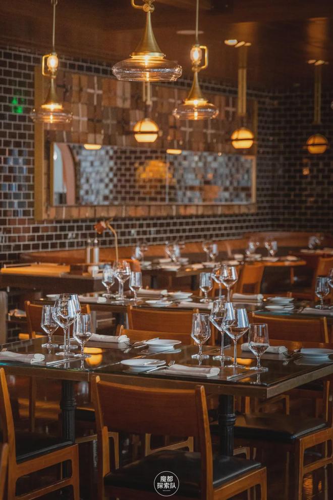 在餐厅的设计上,特色融合了老上海电影主题与美式怀旧酒吧的风格精髓。身处其中仿佛穿越时空,复古灯饰投下温暖光影,木质深调呈现着岁月质感。