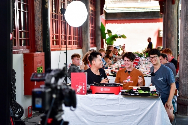 中国网财经7月24日讯 “54321上福袋!”7月14日下午,海底捞外送在成都陕西会馆的百年川西庭院里,展开了一场与众不同的“直播带货”。一群来自美国的大学生化身“主播”,操着还不太流利的中文推介着自己最爱吃的火锅菜。